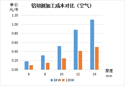 从以上数据可见:对比6KW激光加工成本,12kW激光切割成本基本都可以保持降低一半以上,其中不锈钢优势最大,其次是碳钢、铝。切割不锈钢时使用空气作为辅助气体,单价加工成本最 低,可以满足对切割端面要求不高的产品。