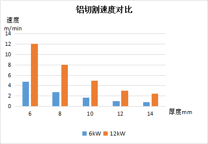 从测试的切割速度得出: 切割碳钢时,12kW激光切割的速度比6kW激光切割的切割速度快87%—493%;切割不锈钢时,12kW激光切割的速度比6kW激光切割的切割速度快163%—289%;切割铝时,12kW激光切割的速度比6kW激光切割的切割速度快150%-213%。